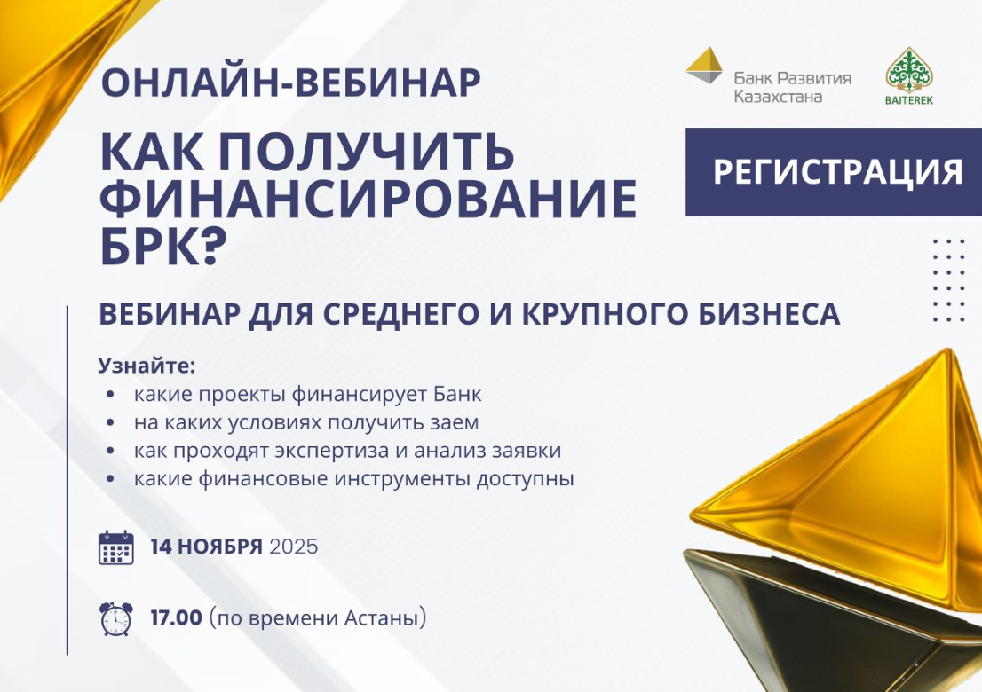 Development Bank of Kazakhstan JSC (a subsidiary of Baiterek Holding, hereinafter – DBK or the Bank) invites potential clients to take part in an online webinar entitled “How to Obtain Financing from DBK.”