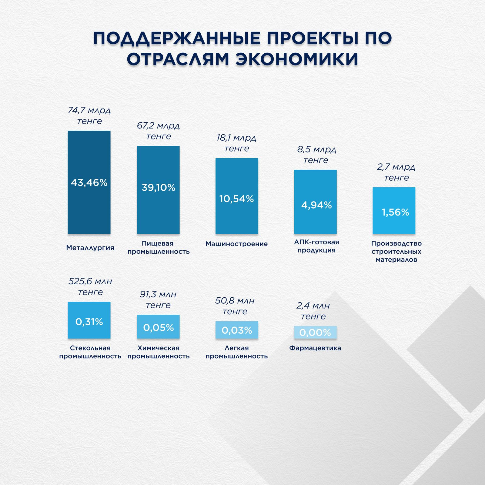 The Karaganda region emerged as the top exporter, accounting for 37.8% of the total export volume. Enterprises in this region received 64.9 billion tenge in support. Following Karaganda were the regions of Kostanay (25.8 billion tenge) and Almaty (21.3 billion tenge).