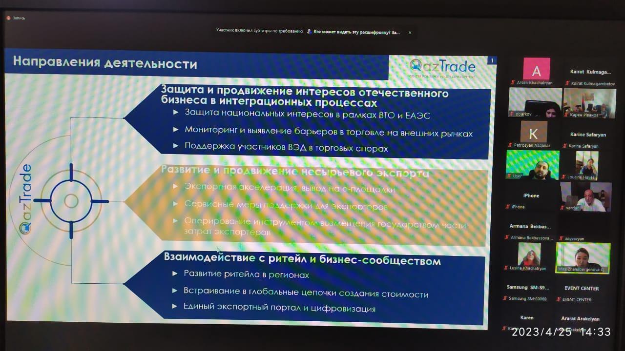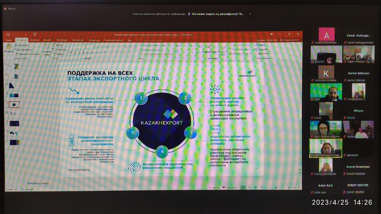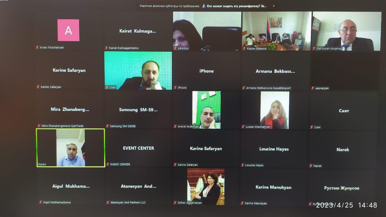 Армения Республикасының Сауда-өнеркәсіп палатасы мен Қазақстан Елшілігінің қолдауымен 2023 жылғы 27-28 сәуірде Ереванда жоспарланған экономикалық ынтымақтастық жөніндегі бірлескен Үкіметаралық комиссияның алдағы 9-шы отырысы шеңберінде онлайн-режимде қазақстан-армян бизнес-форумы өтті. Іс-шараға 47 қазақстандық және армян кәсіпкерлері мен KazakhExport, QazTrade, KazakhInvest, Еуразиялық Даму Банкі, «Арселор Миттал Теміртау» АҚ, Enterprise Armenia инвестицияларды қолдау орталығы, «Оңтүстік Кавказ темір жолы» ЖАҚ және т. б. ұлттық компаниялары қатысты, деп хабарлайды DKNews.kz.