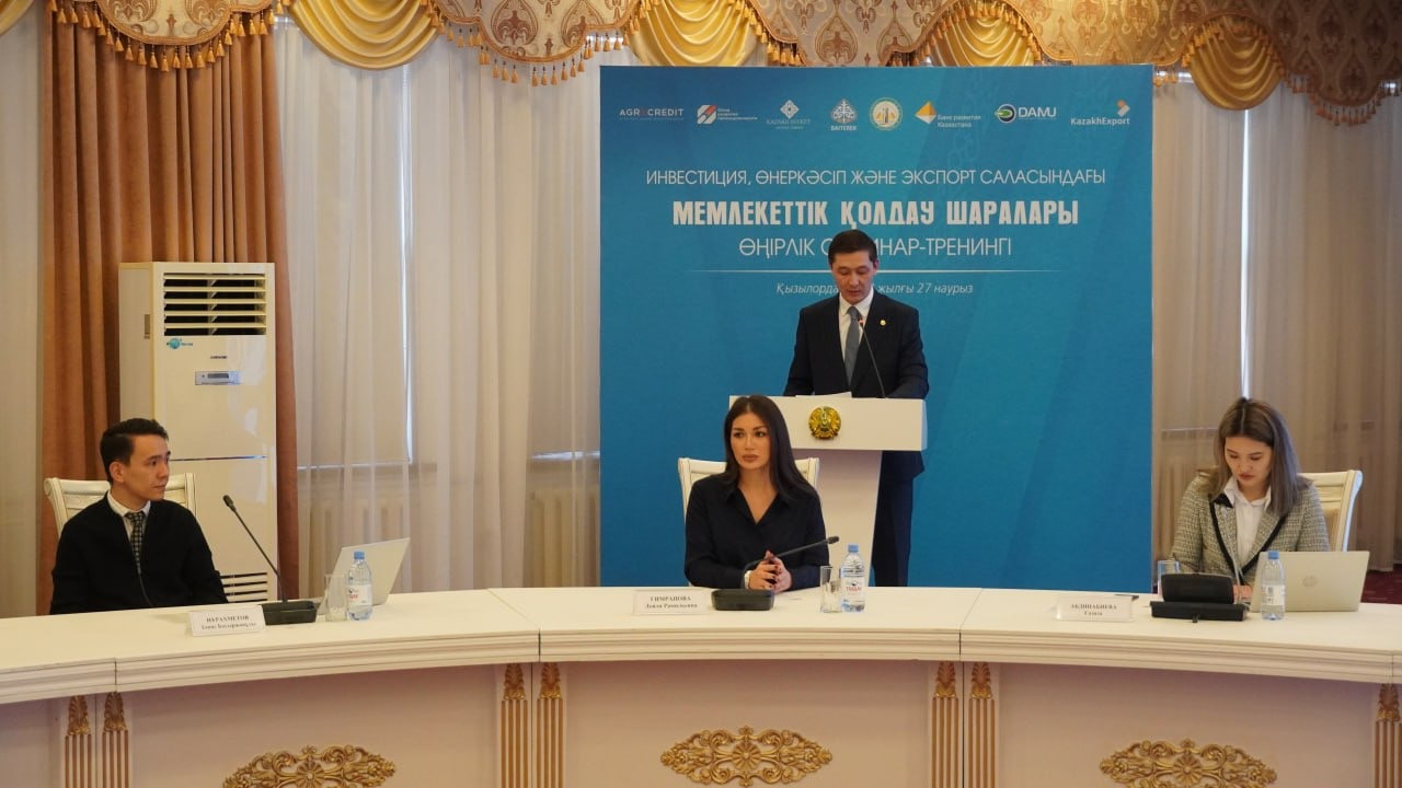 Қызылорда қаласында «KazakhExport» ЭСК» АҚ қатысуымен инвестиция тарту, өнеркәсіпті дамыту және экспортты күшейту бойынша мемлекеттік қолдау шараларына арналған семинар-тренинг өтті.