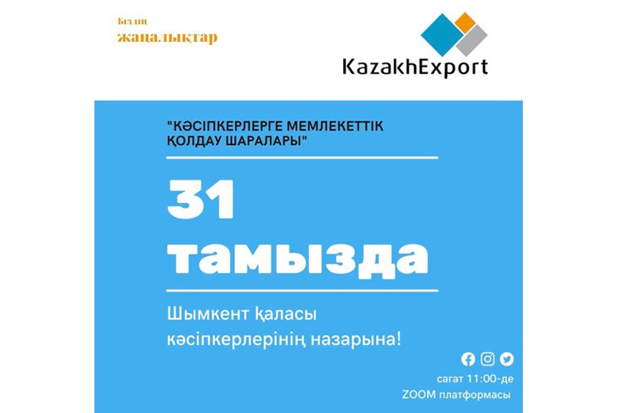 2021 жылдың 31 тамызында Нұр-Сұлтан қаласының уақытымен сағат 11.00-де сіздерді ZOOM платформасы арқылы «Кәсіпкерлерді мемлекеттік қолдау шаралары» тақырыбында онлайн-семинарға қатысуға шақырамыз.