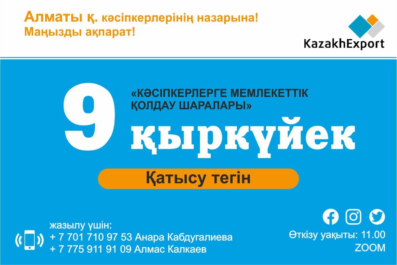 2021 жылы, 9 қыркүйек күні, сағат 11:00-де сіздерді ZOOM платформасындағы «Кәсіпкерлерге мемлекеттік қолдау шаралары» тақырыбындағы онлайн-семинарға қатысуға шақырамыз.