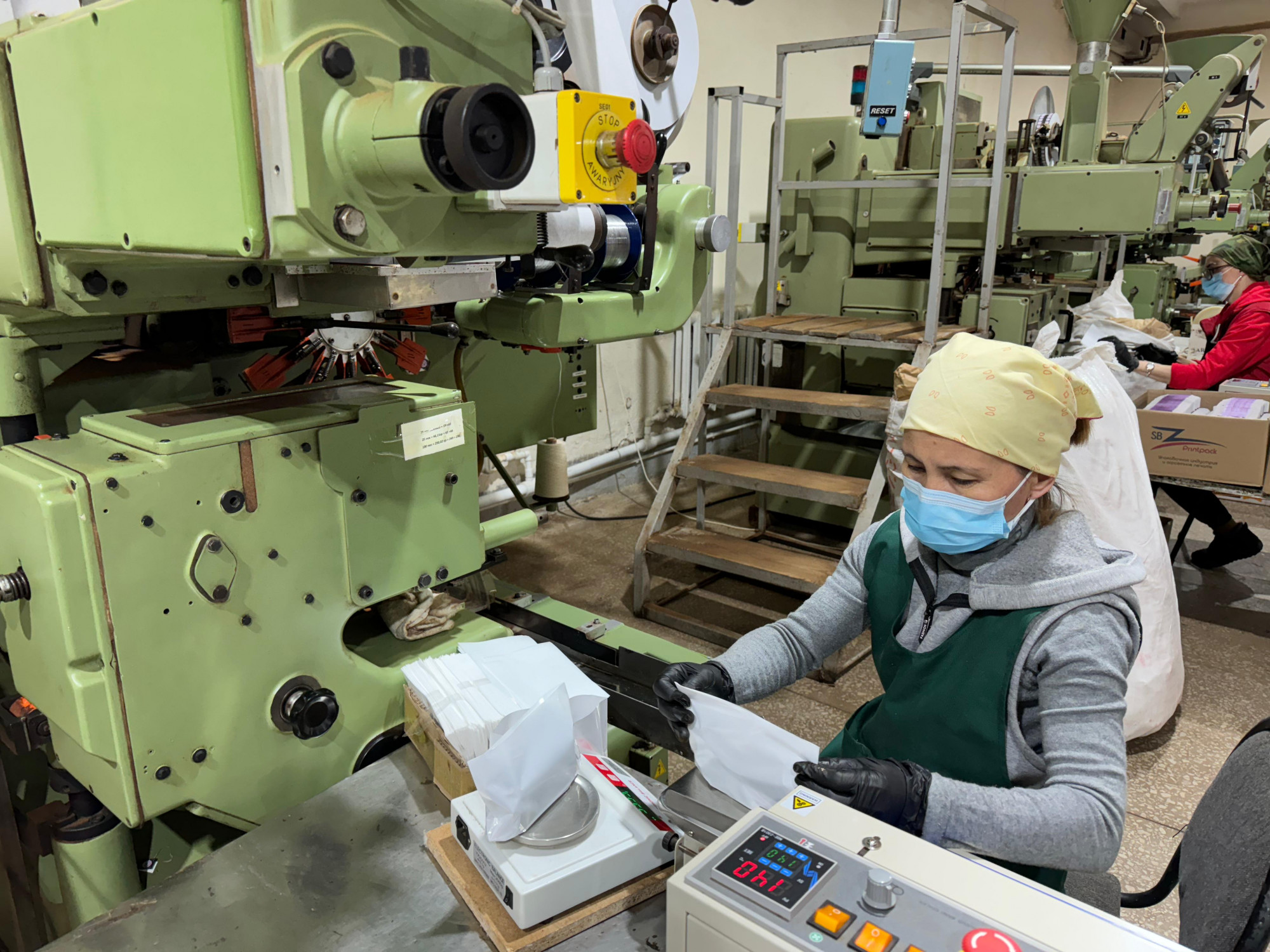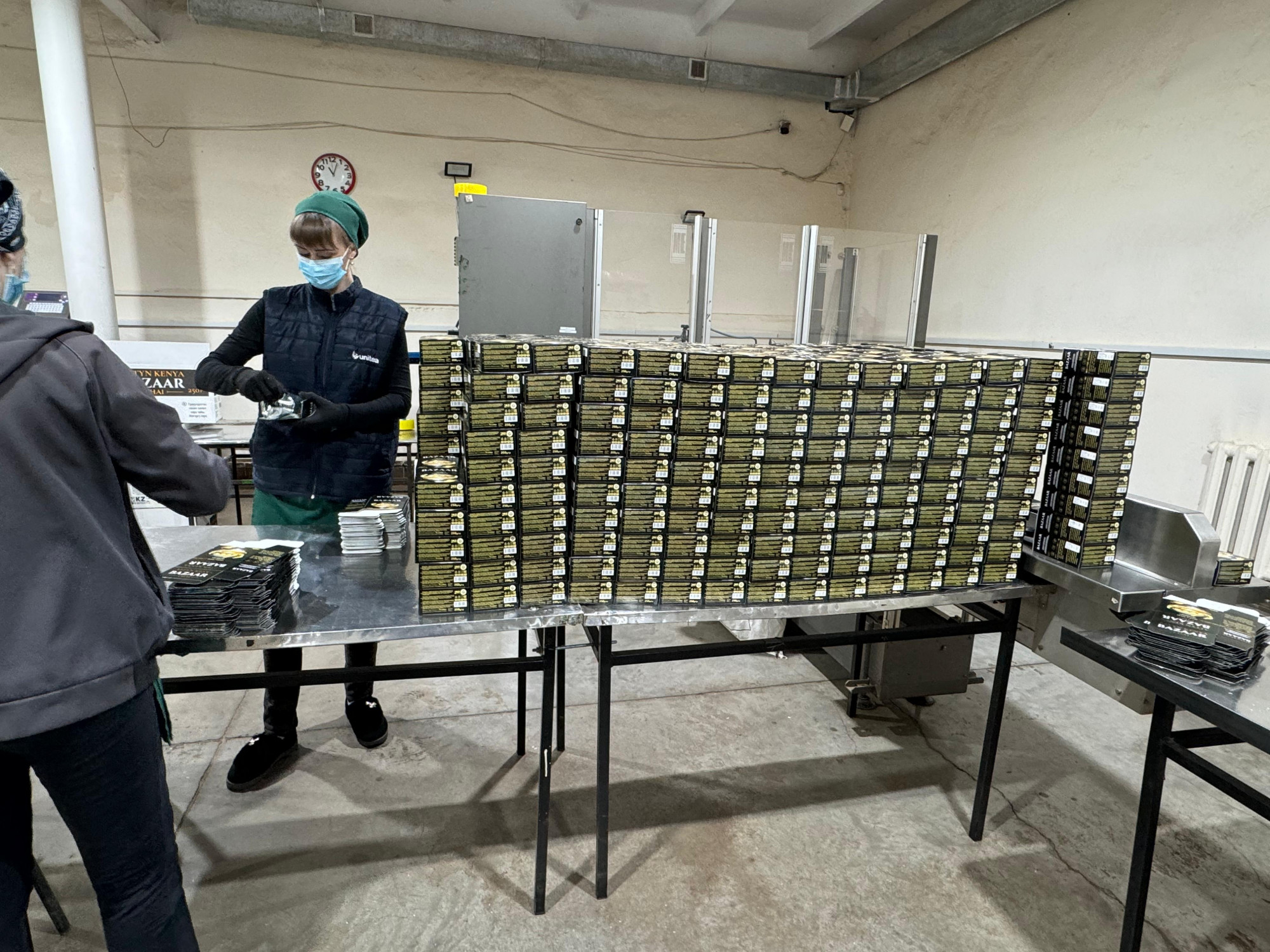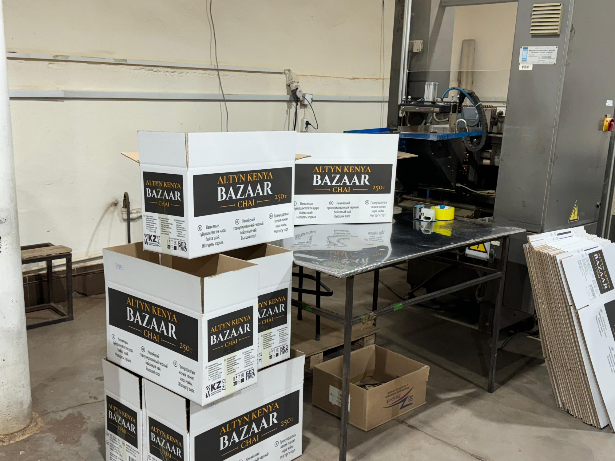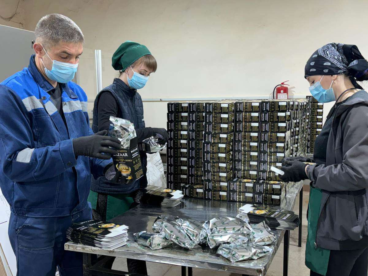 Экскурсию по производству мы начали с цеха, где проходит расфасовка и упаковка чая. Чтобы попасть в Караганду, массивные мешки с сырьем проделали долгий путь из Кении, Индии и Китая, где находятся зарубежные поставщики фабрики. Работу производства открывает начальная линия, на которую в мешках поступает сырье, после чего оно отправляется для дальнейшей обработки в цех. Рабочие – фасовщики и упаковщики в спецодежде и медицинских масках действуют сноровисто, слаженно, каждое их движение доведено до автоматизма. На производстве сегодня трудятся более 80 работников. В их распоряжении – современное оборудование европейского производства.