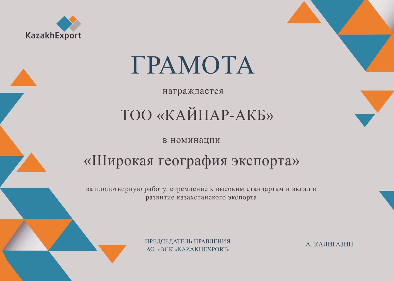 Грамота в номинации «Широкая география экспорта» вручена ТОО «Кайнар-АКБ» за плодотворную работу, стремление к высоким стандартам и вклад в развитие казахстанского экспорта. В рамках страховой поддержки KazakhExport продукция компании экспортируется в Италию, Россию, Грузию, Армению, Таджикистан, Азербайджан, Туркменистан и многие другие страны.