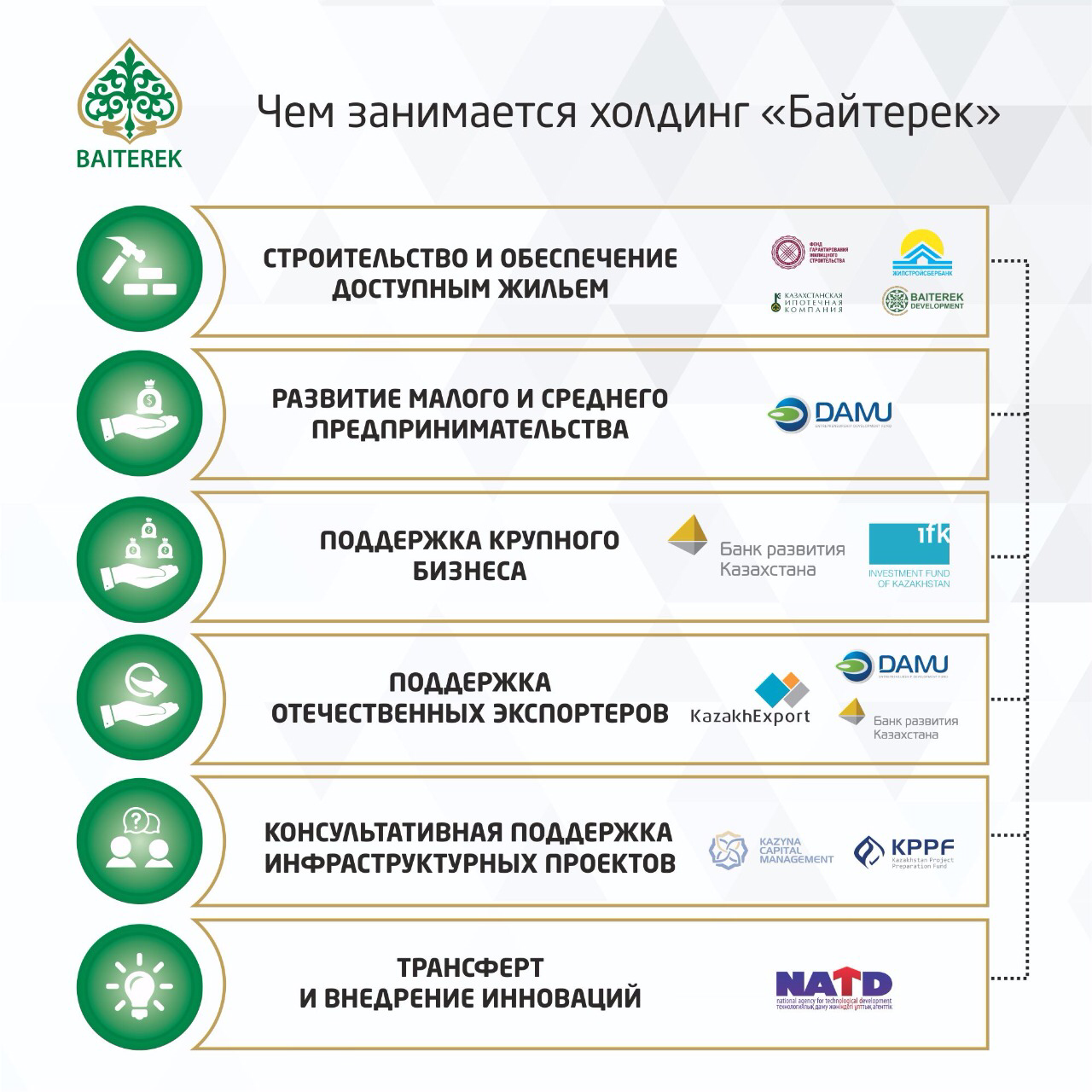 У национального управляющего холдинга «Байтерек» – широкий спектр деятельности. Это в первую очередь связано с его ролью как одного из ключевых финансовых институтов Правительства РК и реализацией целого ряда стратегических направлений, в том числе – обеспечение казахстанцев доступным жильем, развитие предпринимательства и поддержка отечественных экспортеров.