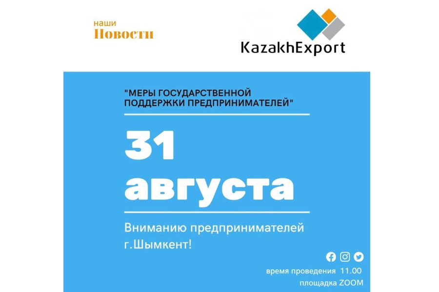 31 августа 2021г. в 11.00 по времени г. Нур-Султан приглашаем вас принять участие в онлайн-семинаре на платформе ZOOM на тему: «Меры государственной поддержки предпринимателей».
