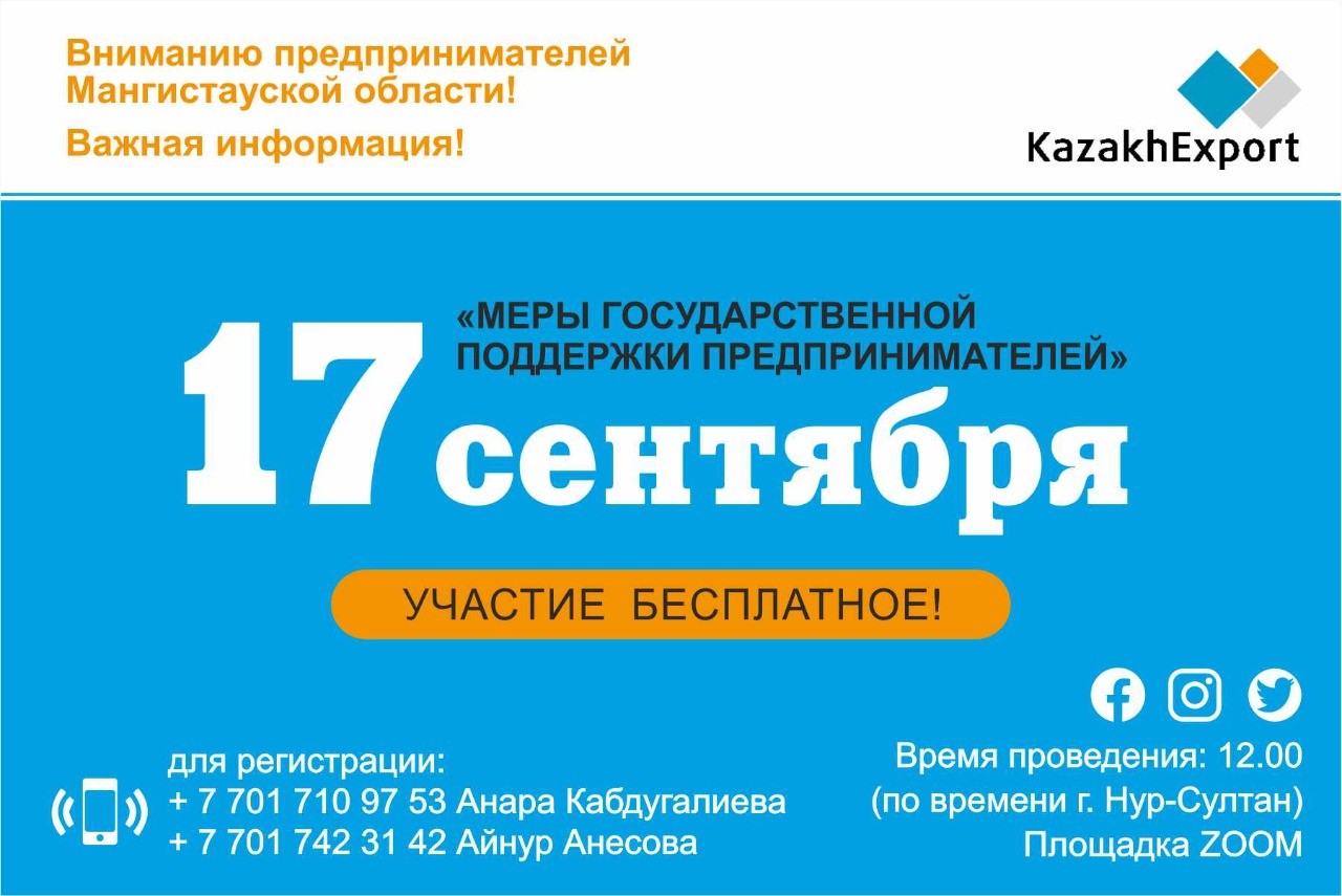 17 сентября 2021 г. в 12.00 часов (по времени г. Нур-Султан) приглашаем вас принять участие в онлайн-семинаре на платформе ZOOM на тему: «Меры государственной поддержки предпринимателей».