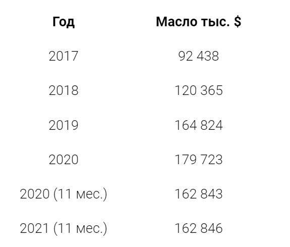 За 11 месяцев 2021 года из Казахстана вывезено масла на 162,8 млн долларов.