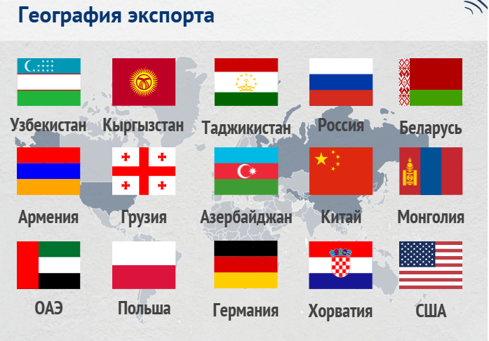 Продукты экспортируются в Центральную Азию (Узбекистан, Кыргызстан, Таджикистан), Россию, Центральную Европу (Польша, Германия, Хорватия), ОАЭ, Китай, США, Беларусь, страны Закавказья (Азербайджан, Армения, Грузия) и Монголию.