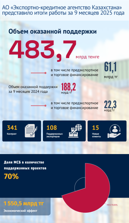 Развитие торговли и расширение экспортного потенциала Казахстана – важнейшие направления государственной политики, и чтобы ее реализовать, нужно укрепить позиции отечественных производителей, увеличить объем несырьевого экспорта и создать благоприятные условия для бизнеса. В этом направлении работает АО «Экспортно-кредитное агентство Казахстана» (ЭКА, Агентство) – национальный институт в области развития и продвижения несырьевого экспорта. В ЭКА подвели итоги 9 месяцев 2025 года, сообщает корреспондент центра деловой информации Kapital.kz.